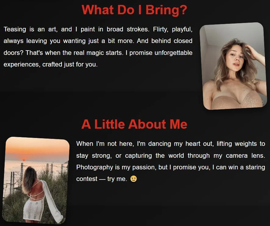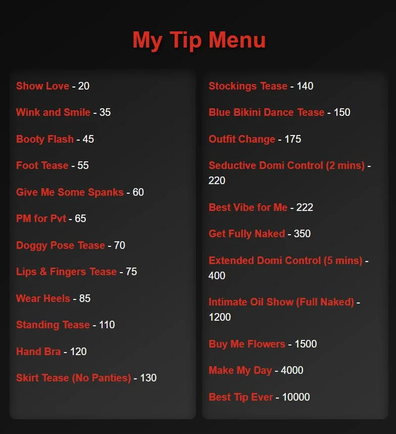 Spanking, Topless, Striptease, Blowjob, Heels, Upskirt, Masturbation, Fingering, Orgasm, Handjob, Foot Fetish, Erotic Dance, Nylon, Nipple Toys, Doggy Style, Cowgirl, Sex Toys, Anal Toys, Dirty Talk, Dildo or Vibrator, Oil Show